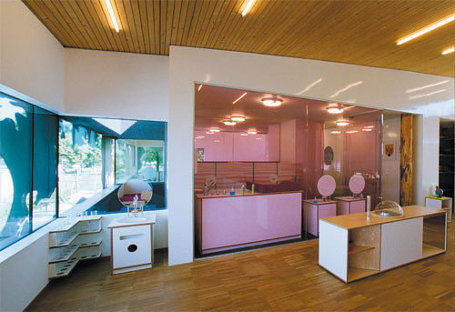 Ein „öffentlicher“ Bereich in der Sockelzone im Erdgeschoss umfasst den Speise- und Lernraum, den Bewegungsraum sowie die notwendigen Nebenräume. Das Obergeschoss teilt sich in vier Gruppenräume, davon zwei Krippenräume mit zwischen liegendem Schlafbereich. Eine zusätzliche Koje, die in das Dach eingeschnitten ist, dient den Kindern als Rückzugsraum. Zwischen den Gruppenräumen sind transparente Sanitär-Gruppen, direkt den Gruppen zugeordnet und Abstellräume eingeschoben.
