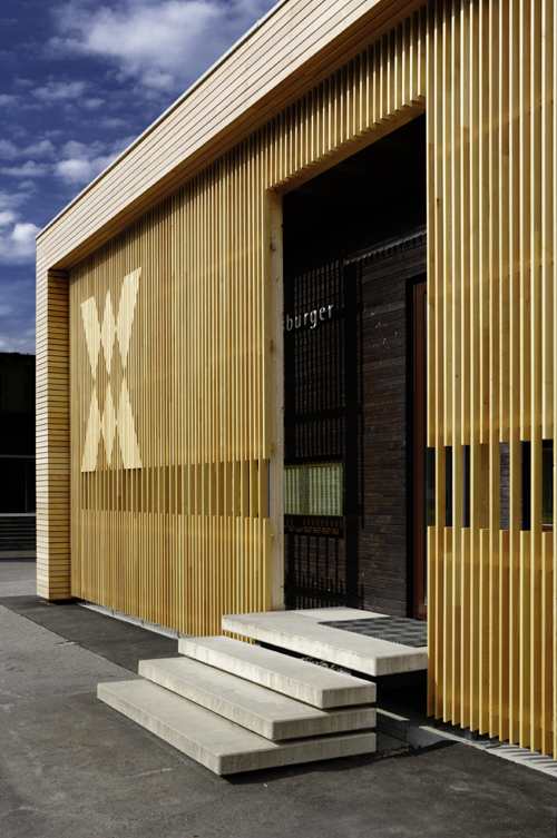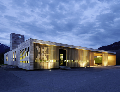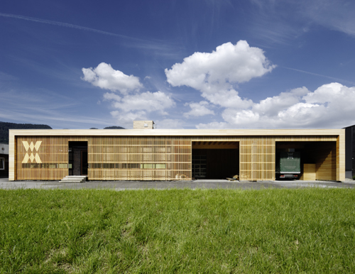 Mit dem neuen Erscheinungsbild macht das Unternehmen von der Hauptstasse aus auf sich aufmerksam. Das Fassadenmaterial Holz ist Symbol dessen, was im Innern des Gebäudes aus diesem Werkstoff produziert wird. Die semitransparente Schalung der vorgelagerten Raumzone lässt verschleierte Durchblicke von der Hauptstrasse zu. Große Öffnungen laden ein in den witterungsgeschützten Vorraum zu treten. Der großflächige ca. 6 m hohe Baukörper wird durch unterschiedliche Ausrichtung und Rasterung der Lärchenschalung gegliedert.