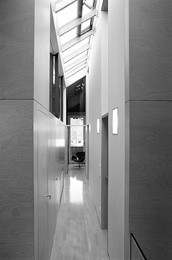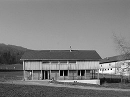 Westwärts vom Betriebsgebäude abgerückt steht das Wohnhaus neben einer großen Weide am flachen Hang: eine Transformation des klassischen Wälderhauses mit seitlichem Eingang durch den südseitigen „Schopf“ und einem Erschließungsbereich quer zur Hausachse als offene, zweigeschossige Zone, welche die Wohnräume von den Arbeitsbereichen trennt; Firstverglasung zur Belichtung des Flurs im OG. Der Innenausbau, vom eigenen Betrieb ausgeführt, demonstriert formal einfache, funktionell ausgeklügelte und technisch perfekte, zeitgenössische Holzverarbeitung. (Text: Otto Kapfinger in „Baukunst in Vorarlberg seit 1980, Hrsg. VAI / KUB“)