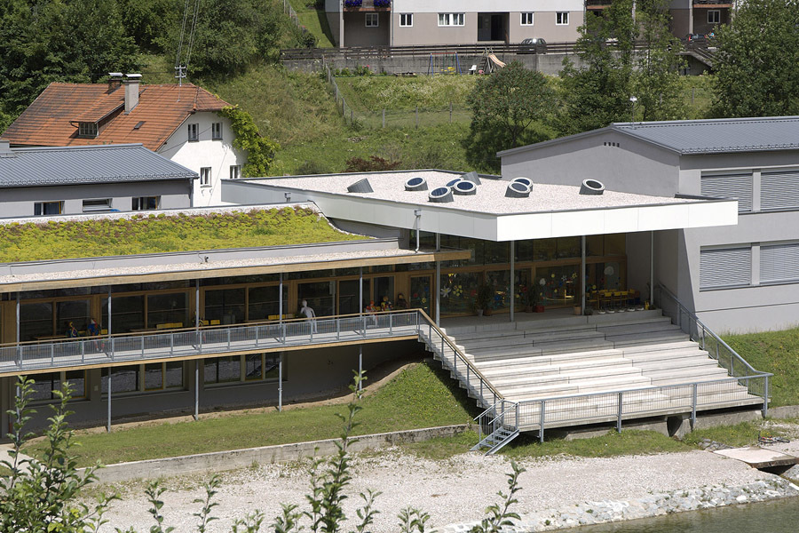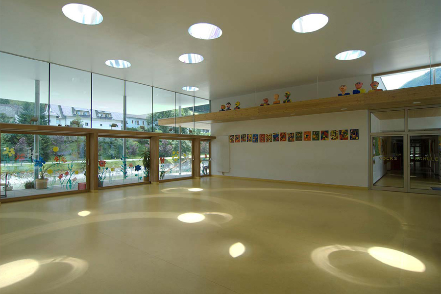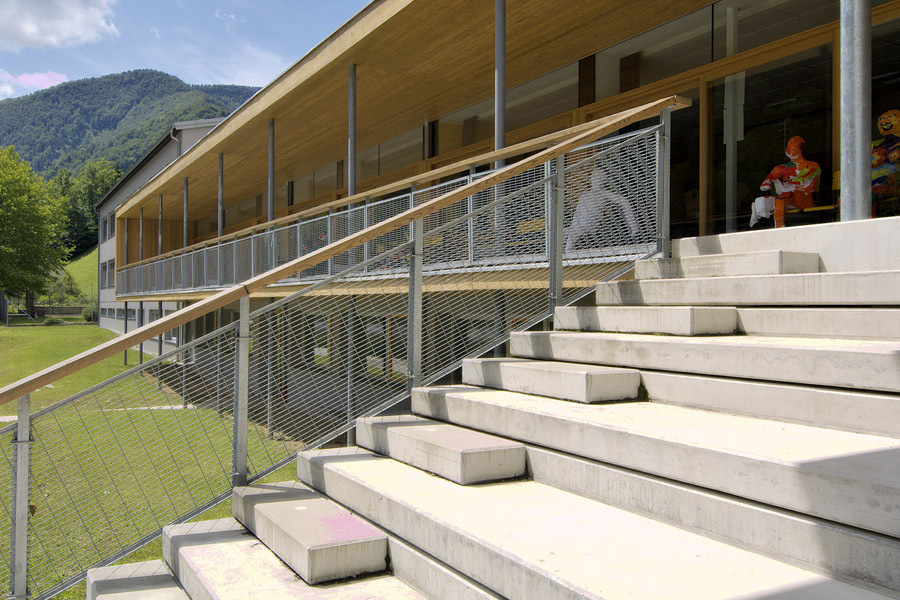 Die Sonderunterrichtsräume im Mitteltrakt erhalten grosse Fassadenöffnungen und Zugang zur Terrasse über dem Fluss.Die offene und durchlässige neue Eingangs- und Pausenhalle verbindet den strassenseitigen Schulhof mit der Flusslandschaft. Die hochglänzende Deckenuntersicht des Hallendaches macht Lichtreflexe und Bewegungen des Flusses bereits vom Eingang aus erlebbar.