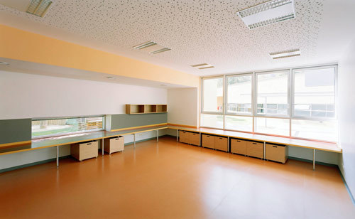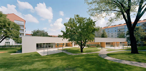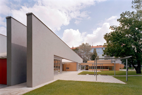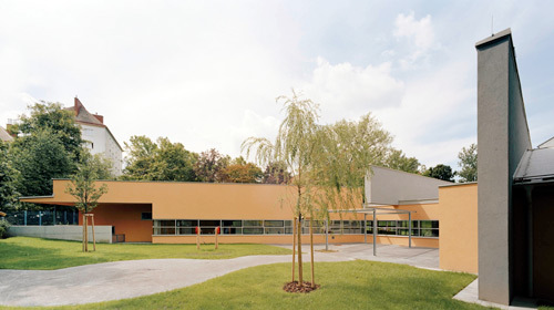 Der errichtete Verbindungstrakt zwischen Zubau und Bestand tritt im Bereich des Haupteinganges in Form eines Vordaches am neu gestalteten Vorplatz in Erscheinung. Allen Krippen und Gruppenräumen sind befestigte Terrassen vorgelagert, deren Beschattung durch Pflanzen, die an den Säulen der Pergolen hinauf ranken, erfolgen wird, da diese mit der Zeit ein Blätterdach ausbilden. (Text: Architekt)