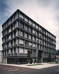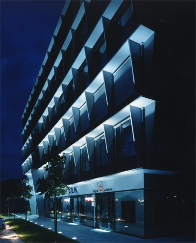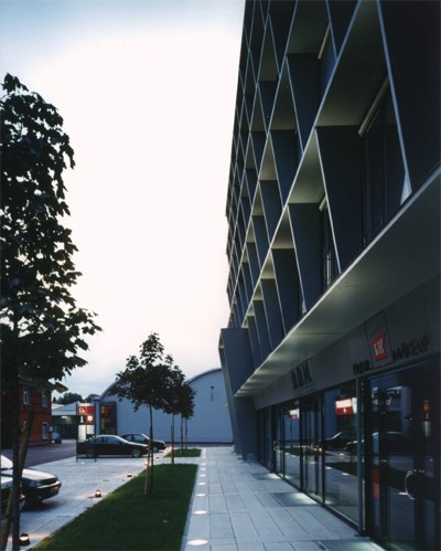 Den Anforderungen entsprechend wurde auch die Konstruktion demzufolge gewählt: Ein Stahlbeton-Skelettbau mit innenliegenden Stahlbeton-Stützen und Stahlstützen hinter der Fassade. Das Erdgeschoss wurde mit einer rahmenlosen Verglasung ausgeführt, in den Obergeschossen sind Holzfenster mit vorgelagerter Horizontal- / Vertikallamellenstruktur eingebaut. Im Norden wurde die Fassade mit Eternitelementen verkleidet. Durch die effekvolle, indirekte Beleuchtung bei Einbrechender Dämmerung, wird die Fassade plastisch in Szene gesetzt und bildet mit der Struktur der Shedhalle eine vertraute Einheit. (14.05.2001)