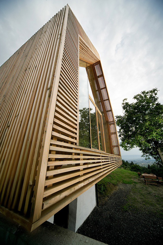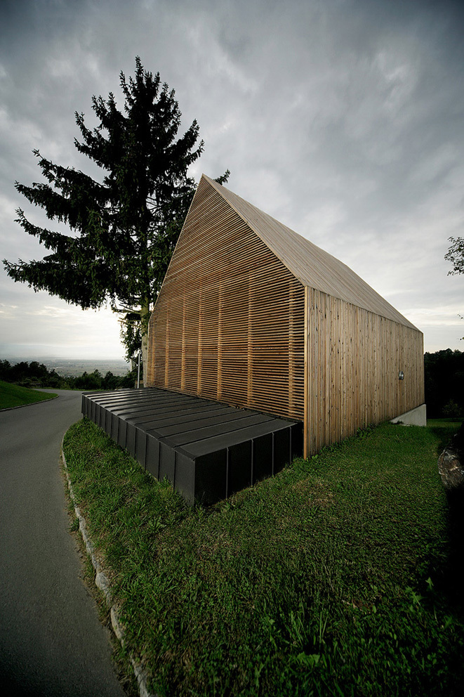 Weinpressen waren reine Funktionsbauten. Sie wurden als Ein-Raum-Architekturen errichtet, meist ohne Fenster. Der Charakter entspricht einer landwirtschaftlich, technisch genutzten Räumlichkeit, einer kleinen Scheune oder einem Schuppen. Die neue Räumlichkeit übernimmt die Funktion des ‚Ein-Raumes’. Wohnen, Essen, Bad und Schlafen sind in einem offenen Raum angeordnet Alle Fenster und auch der Eingang werden von der Fassadenstruktur verborgen. Nur die NW-seitige Giebelfront öffnet sich zur Landschaft.