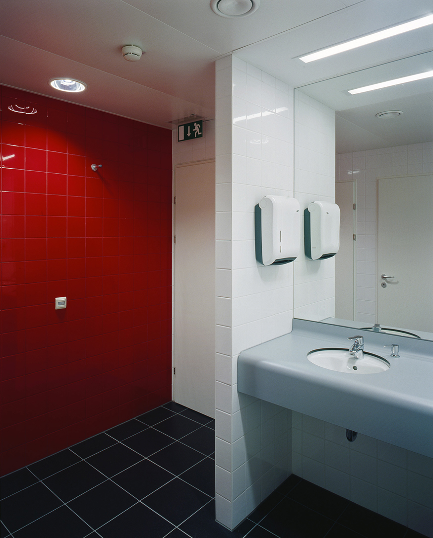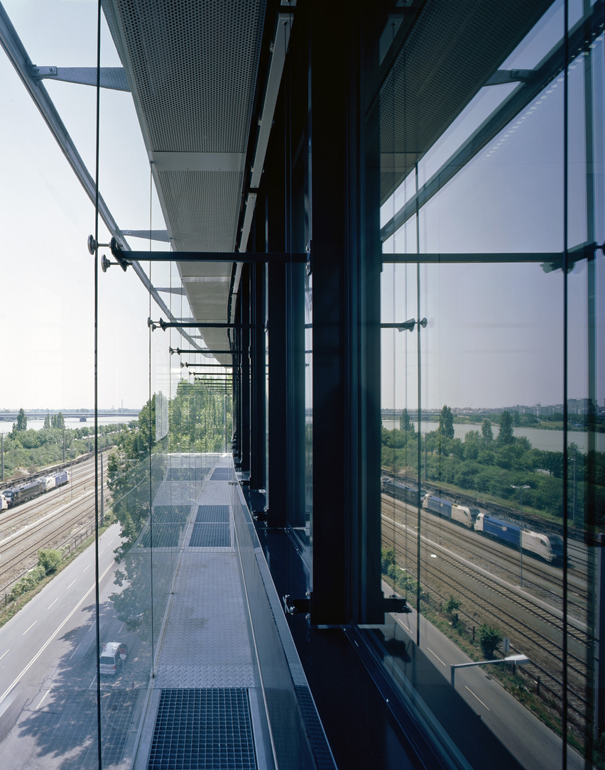 Die Glasfassade der Regelgeschosse ist am Handelskai und an der Weschelstraße wellenförmig gebogen und nimmt mit ihren Schwingungen Bezug auf das fließende Wasser der gegenüberliegenden Donau. Sämtliche Fensterkonstruktionen im Bereich von Aufenthaltsräumen sind schallschutztechnisch optimiert als 2-schalige Fassaden, deren Scheibenzwischenraum mit beweglichen Sonnenschutzlamellen ausgestattet und in den Regelgeschossen zu Reinigungszwecken begehbar ist, ausgeführt. Die nicht transparenten Teile der Fassade werden mit einer hinterlüfteten Blechfassade verkleidet. (Marion Kuzmany, teilweise nach einem Text der Architekten)