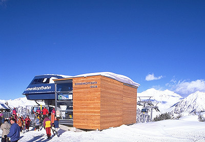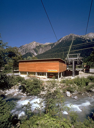 Zum Wald hin greift der Bau mit Betonpfeilern auf eine tiefere Hangstufe hinunter und überdeckt dort die Servicebereiche und einen quer verlaufenden Durchgang. (Text: Otto Kapfinger in „Baukunst in Vorarlberg seit 1980, Hrsg. VAI / KUB“)