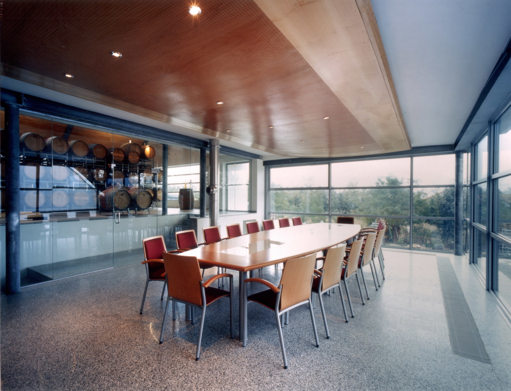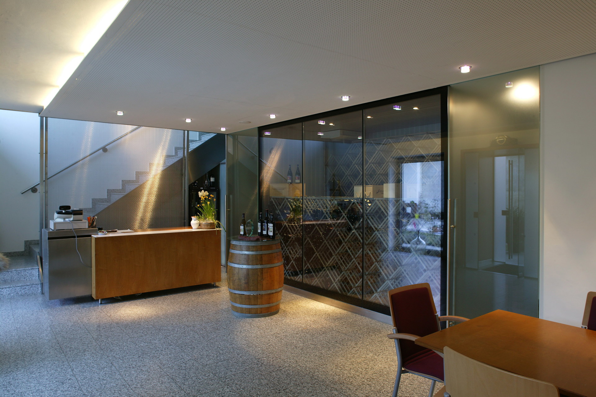 Der kubische, zweiseitig verglaste Präsentationsraum „schwebt“ über dem historischen Gewölbekeller und ist räumlich mit dem dachgeschossigen Fasslagerraum verbunden. Firstverglasung und raumhohe Glaswände ermöglichen Blickbeziehungen in die Funktions- und Außenbereiche.