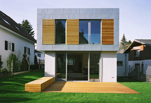 Dieses Wohnhaus mit Flachdach zeigt sich modern und zeitgemäß. Die Fassade: Einfacher weißer Putz im Erdgeschoss, darüber etwas vorspringend das Obergeschoss umhüllt mit Titanzink Rheinzink (blaugrau vorbewittert). Die gesamte Metallverkleidung wurde auf einer Unterkonstruktion mit Vollschalung, Wärmedämmung und mit entsprechenden Hinterlüftungsquerschnitt unsichtbar montiert. Für die Be- und Entlüftung der Hinterlüftung und für die Dachentwässerung wurde ein maßgeschneiderte spenglertechnische Lösung entwickelt. Dieses moderne Wohnhaus, das die präzise Antwort auf die Wünsche des Bauherrn und die gegebene Grundstücksituation und die Bauvorschriften gibt, entstand durch die gute Zusammenarbeit aller Beteiligten. (Text: Architekt)