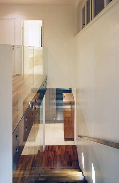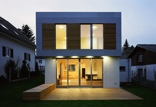 Wie immer waren es die Standortfaktoren, die auf die Planung von Öffnungen, Form und Hülle des Gebäudes wirkten. Das Grundstück selbst geht als fixe Variable in der Planung ein - Grundstückform, Umgebung und Sonnenlauf beeinflussten die Tageslichtführung und die Form des Gebäudes. Die Energie der Sonne wird bei diesem Haus optimal genutzt: einerseits durch große Fensteröffnungen, andererseits durch Solarenergiekollektoren am Flachdach. Individuelle Fensterlösungen schützen einerseits die Privatsphäre lassen aber gleichzeitig Innenraum und Außenraum verschmelzen. Eckfensterlösungen und passender Sonnenschutz tragen zur perfekten Lichtführung bei. Schiebetüren verschwinden unsichtbar, trennen und eröffnen Räume. Alles ist genau geplant, die praktischen Vorratsschränken in der Küche aber auch der Blick in den Himmel von der Badewanne aus. Das Haus öffnet sich von der Eingangszone über den Essbereich, hin zu einem sich großzügig in Höhe und Breite weitenden Wohnraum, der in eine Lärchenholzterrasse übergeht. Das Blickfeld der Küche reicht vom Eingangsbereich bis zur alten Steinmauer am Ende des Gartens. Eine gemauerte Treppe führt direkt von der Eingangszone in das Obergeschoss, zum Bad und zu den Schlafräumen. Auch hier öffnet sich das Haus dem Garten zu durch große Verglasungen. Raffiniert sind die horizontal strukturierten verschiebbaren Holzfensterläden, die bei geschlossenem Zustand eine hellgrüne Wand freigeben. Die Form des Rechteckes bestimmte diese Planung, sie spiegelt die Grundstücksform im Hausgrundriss und findet sich bei allen Details bis hin zu den Fassadenrauten wieder. Die Einheit in der Formgebung, eine durchgehende Farbengestaltung und die Materialwahl – Titanzink, Holz, Naturstein und Glas - unterstreichen die Großzügigkeit dieses Gebäudes.