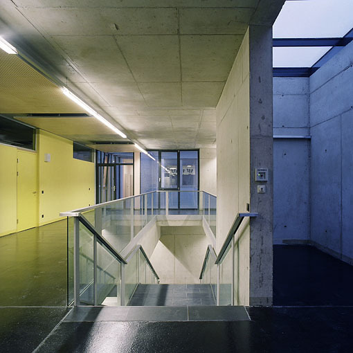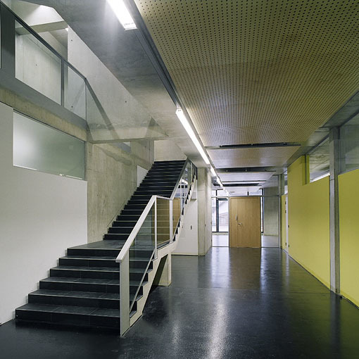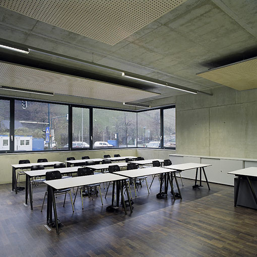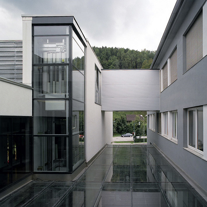 Der gesamte überirdische Teil des Neubaus besteht im Wesentlichen aus 3-geschossigen vertikalen Stahlbeton-Wandscheiben, welche den darunter liegenden Turnsaal überspannen und somit ein Raumtragwerk bilden. gekürzter Architektentext