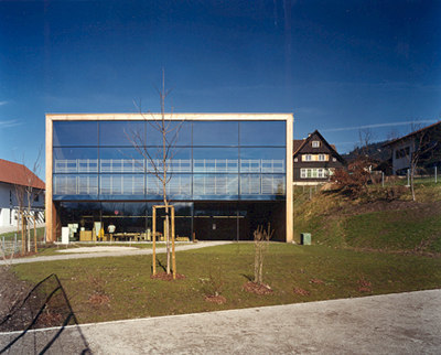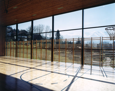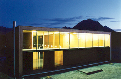 Auf einem massiven Sockel erhebt sich die Holzkonstruktion aus Holzkastenelementen. Alle sichtbaren Holzstützen sind aus Lärchenholz gefertigt. Das Bergpanorama der umgebenden Landschaft bildet den perfekten Rahmen dieser eleganten, modernen Bebauung. (04.06.2001)