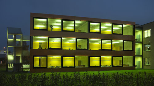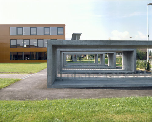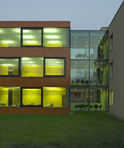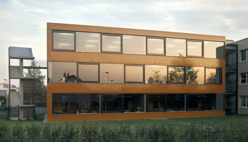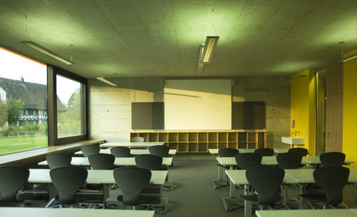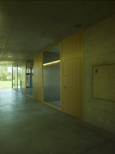 Bei den Schiebefenstern ist der festverglaste Teil rahmenlos, der zusätzlich aufgesetzte äussere Rahmen des Schiebers ist fest und übernimmt im offenen Zustand einerseits die Absturzsicherung, andererseits bewirkt er dass man im offenen Zustand meint, das Fenster sei geschlossen und umgekehrt. Stockwerkübergreifend wurden Betonschotten mit OSB-Schalungsplatten gegossen um eine strukturelle und texturale Verbindung zu den OSB-Leichtbautrennwandelementen der Gruppenräume zu erreichen.