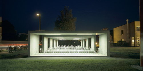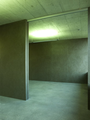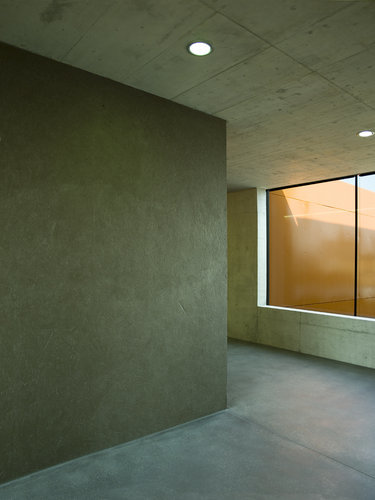 Farbe dient hier als optisches Verbindungsglied zweier unterschiedlicher Baustoffe. Durch die Spezialbeschichtung wirkt die Oberfläche monolithisch - natürlich und vermittelt nicht den Eindruck einer „angestrichenen“ Oberfläche. Das Auge, der Tastsinn und das Gehör werden getäuscht: Bei der Berührung der Wand könnten die Unterschiede nicht grösser sein. (nach einem Text der Architekten)