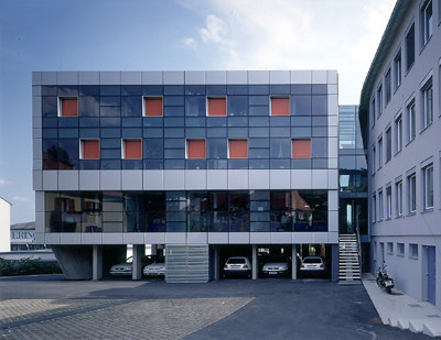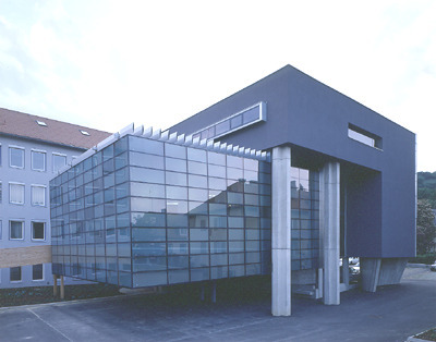 Der Bürotrakt erstreckt sich über drei Geschosse. Wie ein grosses Fenster präsentiert sich die Rückseite mit der farbigen Glasfassade. Die eigentlichen Fenster bilden als einzige Elemente geschlossene Flächen, nur wenn man diese öffnet sieht man hinaus. Die Fassade ist transparent und die Fenster sind geschlossen so präsentiert sich diese inverse Fassade.