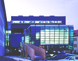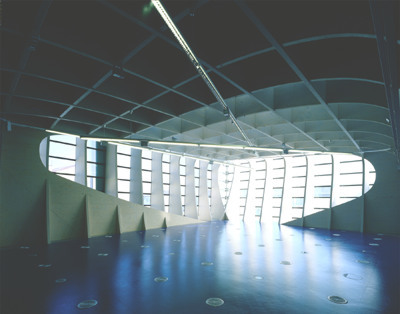 Um eine runde und freie Raumbildung zu erhalten wurde die Holzspantenkonstruktion aus dem Schiff- und Flugzeugbau adaptiert. Die Brettschichtholzplatten bilden die Form und tragen die äussere Glashülle, die den gesamten Körper bedeckt. Die Ausführung erfolgte in zweischichtiger Isolierverglasung mit unregelmässig eingelegten semitransparenten Folien. Unter Tags bleibt das Innere durch die blau-transparente Hülle verborgen, nachts wird die innere Form nach außen deutlich sichtbar. Die Lamellen auf dem Dach werden nach dem Stand der Sonne ausgerichtet und lassen sich für Vorträge komplett schließen. Dadurch ergibt sich durch die Spanten-Konstruktion im Inneren ein ständiges Spiel mit Licht und Schatten. (28.05.2001)