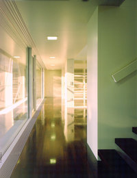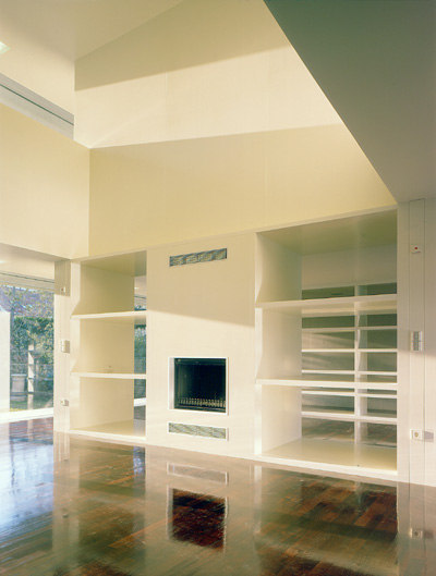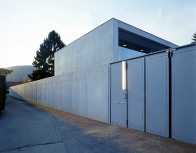Die ganze regal- und möbelhafte Innenausstattung hat den schimmernden, gebrochenen Weißton der elektrischen Schalter, welche die Markisen und Vorhänge bewegen, Licht, Energie und Klima regeln. Auch in den masslichen Rhythmen ist diese entstofflichte Innenwelt von der Präsenz des tragenden Betonrahmens und den Glasteilungen gelöst. Nikolaus Hellmayr nannte es ein „dialektisches Familienregal“, das klassische Themen anspricht - und mehrfach gegen den Strich bürstet. (Text: Otto Kapfinger, 29.10.2002)