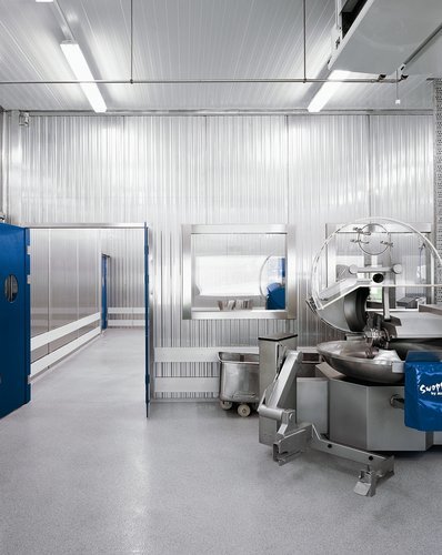 Die direkte Platzierung des Neubaus an der Straße versucht die Moorlandschaft zu schonen und räumlich den Ortsanfang zu definieren. Wesentliche Vorgabe ist ebenfalls das sehr komplexe Raumprogramm. Hygienevorschriften, vorgegebene Produktionsabläufe, sauber getrennte und zwingend überdachte An- und Auslieferungszonen mit unterschiedlichen Raumhöhen und Erschließungsniveaus sollten in einem homogenen, kompakten Volumen, das sich schlicht und selbstverständlich in die Landschaft einfügt untergebracht werden.