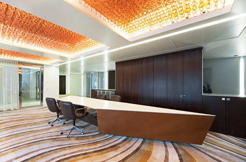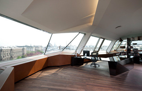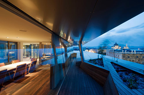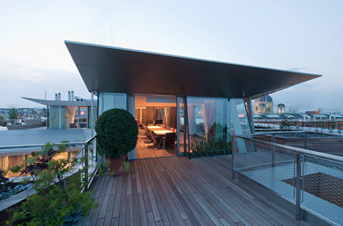 Der Architekt hat in Wien schon mehrere Dachausbauten realisiert. Für diesen Dachaufbau wurde eine Homogenität des Baukörpers geschaffen, die bei Wohnungen schwer umsetzbar sind. Denn Dachwohnungen müssen zwangsläufig auch Dachterrassen beinhalten, welche widerum die Homogenität des Baukörpers brechen. Anstelle weitläufiger Terrassen auf allen Ebenen ragen hier kleine Raucherbalkone in den Lichthof, sie bieten gerade Platz für ein Bäumchen im Topf. Straßenseitig präsentiert sich der Dachausbau als geschlossener Körper, kein Türmchen markiert den Abschluss. Statt dessen präsentiert sich die Eckausbildung mit einer „kobraähnlichen Erhöhung“, so der Architekt.
