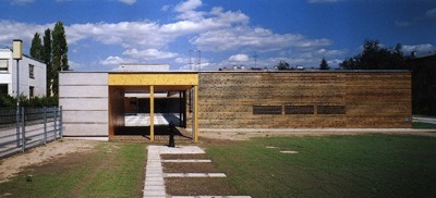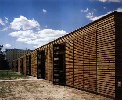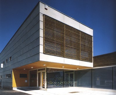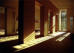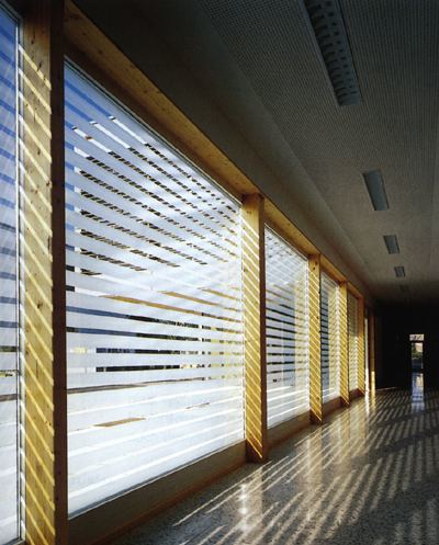 Dementsprechend sind die Gruppenräume großflächig verglast und nach Süden zum Garten orientiert. Die hier als vierte funktionale Schiene vorgelagerte Terrasse changiert zwischen einer luftigen Raumzone bei aufgeklappten Jalousien und, bei zugezogener Membran, einem Raum, erfüllt von Schattenwürfen, die Wände, Boden und Decke relativieren. Eine Qualität, die wohl der „atmosphärischen Verdichtung“, von der die Architekten immer wieder sprechen, nahe kommt, und sich auch im subtilen Gegeneinandersetzen von transparenten und geschlossenen Momenten, in den feinen Farbund Materialkombinationen niederschlägt. Nach aussen vermittelt der Bau zunächst durch die ringsum vorgeblendete Lärchenholzmembran eine gewisse Kompaktheit.