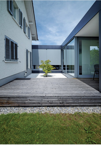 Im flach gedeckten Holzbau, der zusammen mit dem Altbau einen japanisch anmutenden Hof umschliesst, fanden der Wohn- und Essraum sowie die Küche Platz, davor liegt eine teilweise gedeckte Terrasse. Dank der Auslagerung der grossen Räume musste man die kleinteilige Struktur des „Hüslis“ nicht antasten, in den alten Räumen sind wie bis anhin die Schlafzimmer untergebracht.