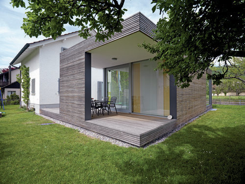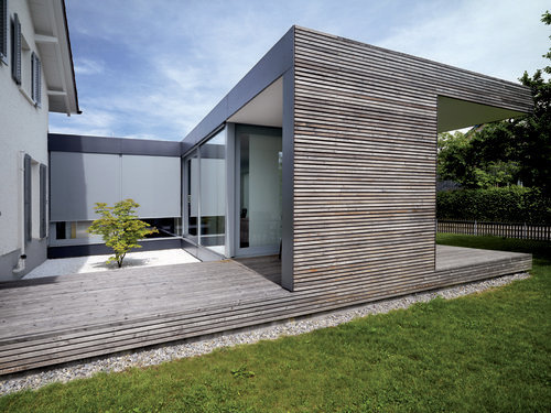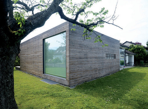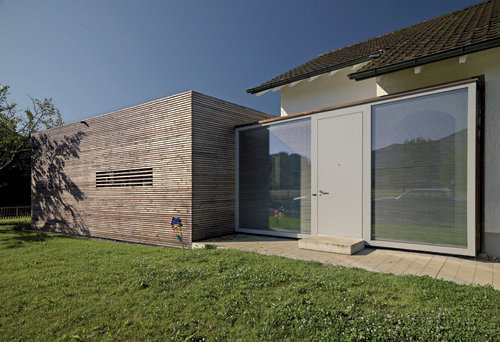 Der Anbau wurde nach ökologischen Grundsätzen geplant. Der Elementbau ist mit 24cm Wärmedämmung eingepackt und mit einer hinterlüfteten horizontalen Lärchenschalung verkleidet. In einer ersten Phase wurde die best. Ölheizung belassen, mittelfristig überlegt sich die Bauherrschaft aber den Einsatz einer umweltfreundlicheren Heizart. (nach einem Text der Architekten)