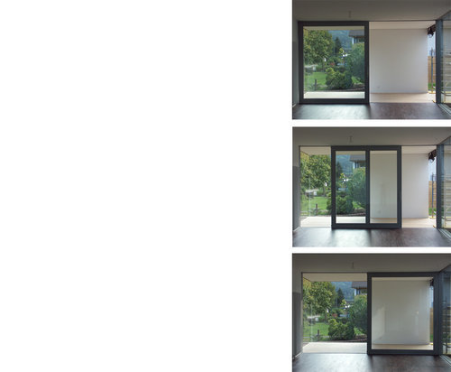 Inszeniert wurde die Verbindung von Alt und Neu beim Eingang: Der vorgelagerte verglaste Körper dient als Gelenk und Bindeglied zwischen alt und neu und lässt die dahinterliegende ehemalige Aussenwand des best. EFH mit Fenster und Jalousieladen sichtbar bleiben.