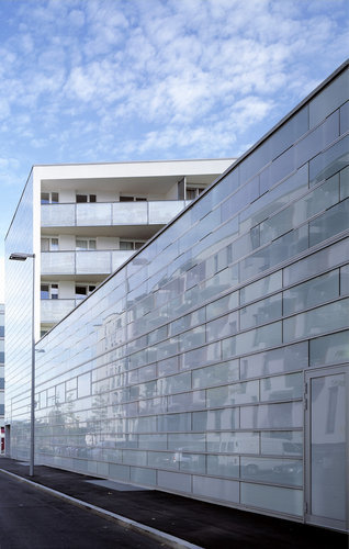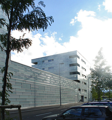 Die einzelnen Bauteile – Platte, Winkel und Kubus – sind von einer hinterlüfteten Leichtkonstruktion mit emailliertem Glas in unterschiedlichen Transparenzstufen überzogen. Durch diese einheitliche Gestaltung entsteht eine monolithische Wirkung des Gesamtköpers, die den großstädtischen Gesamtcharakter des Projekts verstärkt und die Städtebau-Intention des Masterplans unterstreicht. (Text: Claudia Wedekind nach einem Text der Architekten)