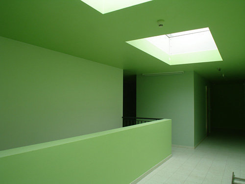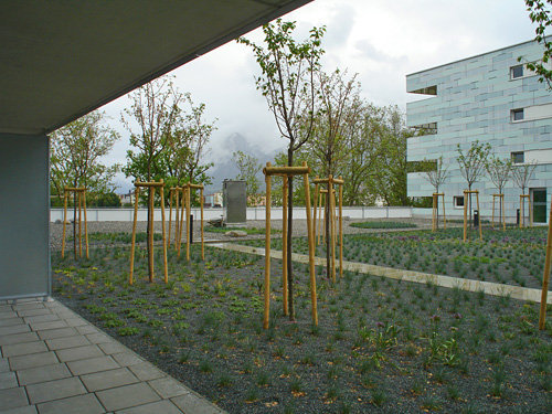 Die insgesamt 90 Wohnungen sind über zentral gelegene Stiegenhäuser und Lifte erschlossen und konsequent vom Südring abgewandt – entlang der straßenseitigen Baukörperseite bietet ein vorgelagerter Laubengang die notwendige Abschottung. Sämtlichen Wohnungen ist eine Terrasse bzw. ein breiter Balkon zugeordnet, raumhohe Fensterelemente optimieren die Belichtung der Wohn- und Schlafräume.