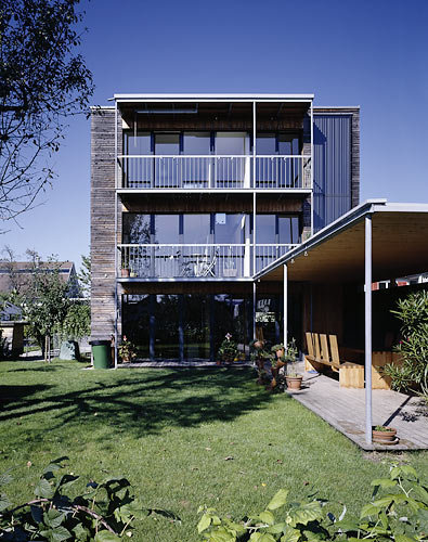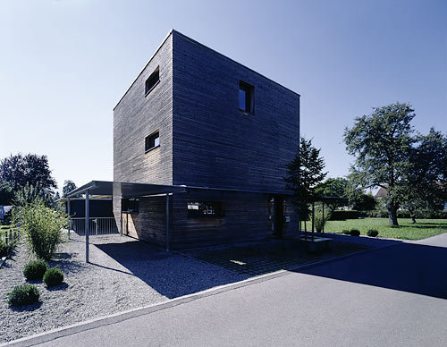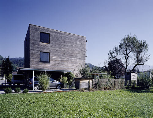 Situation | Eine typische Vorarlberger Einfamilienhausgegend mit sehr kleinem Grundstück von 450 m² und großflächigen Wünschen der Bauherren war Ausgangslage. Um 150 m² Wohnen, 2 Autoabstellplätze, Nebengebäude, gedeckte Terrasse, maximale Gartengröße für Kinder und Hund unterzubringen wird ein Würfel mit 8,5 m gewählt. Dieser sitzt an der Breitseite mittig und ganz an die Straße gerückt, sodass unter Einhaltung aller Abstandsflächen ein maximaler Garten mit sehr großzügig überdachtem Freiplatz übrig bleibt und die zwei Carport-Flügel links und rechts des Hauses auskragen. Damit die Holzfassade gleichmäßig ergraut, wird ein Spalt gelassen.Innenleben| Die Dreigeschossigkeit lässt reizvolle Schichtungen der Nutzung zu. Das Erdgeschoß beginnt mit Küche – Essen und Bibliothek, im nächsten Stock folgt ein `Soundraum´ und der Elternbereich, ganz oben Kinder- und Arbeitsbereich. Leichte Möbelstücke dienen als Geländer, die einläufige, mittige Treppe strukturiert die Grundrisse in allen Ebenen.
