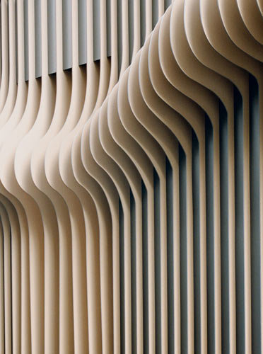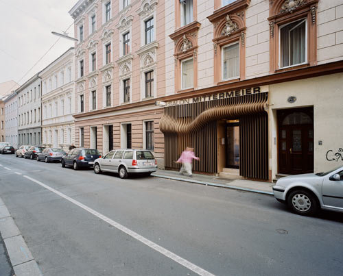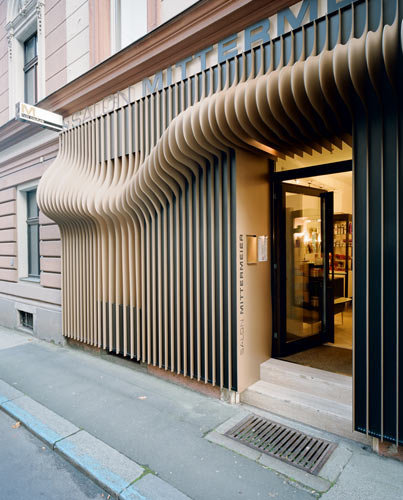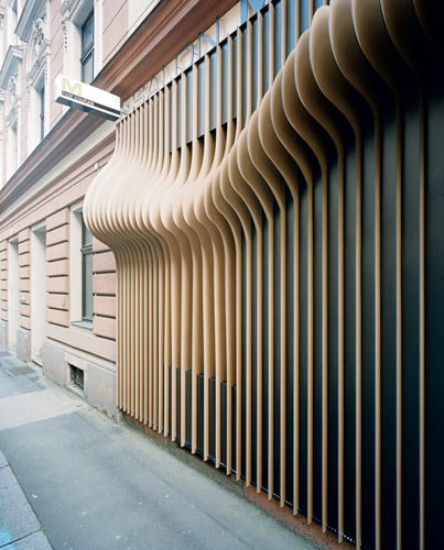 Als Material für die Haarwelle fanden Compactplatten Verwendung, die vertikal, im rechten Winkel zur Fassade, mit unterschiedlichen Abständen angeordnet wurden. Die Formen zu den einzelnen Platten entstanden in einem 3D-Konstruktionsverfahren, das Zurechtschneiden erfolgte mittels Waterjet. Der Kontext der Umsetzung erstreckt sich dabei auch über die Farbgebung der Compactplatten – ein gewissermaßen zwischen blond und brünett schwankender Goldton. Ein im Eingangsbereich in die Fassade integrierter Handlauf lässt erkennen, dass bei aller Wertlegung auf die Grundidee auch stets auf die Funktion geachtet wurde. (Text: Andreas Kump)