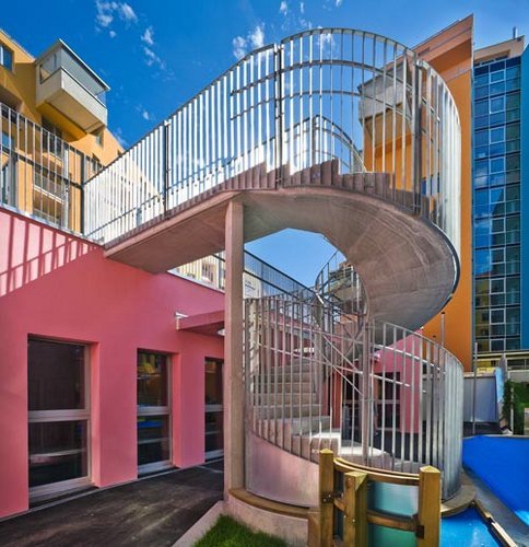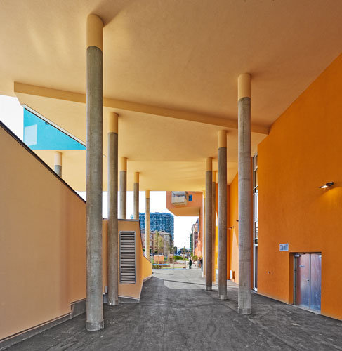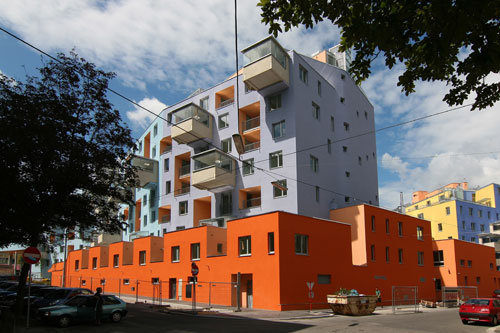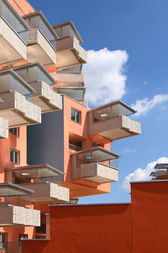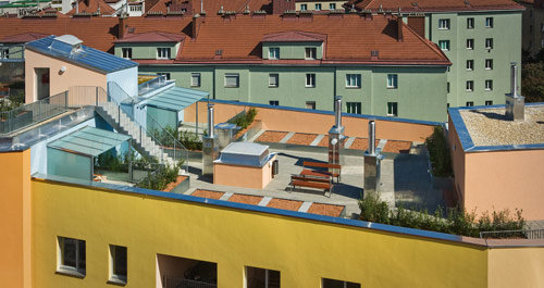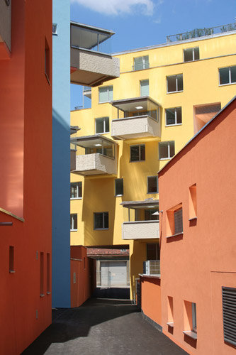 Die öffentliche Durchwegung, vorbei an Gartenmauern und Plätzchen, Kindergarten und Sitzbank, kann insofern als echte Annehmlichkeit bezeichnet werden, als sie arglose Passanten nicht in voyeuristische Eindringlinge verwandelt. Privates bleibt geschützt, Gemeinschaftliches ist zumindest in der Möglichkeitsform angelegt. Die Bewohner der Wohnhausanlage werden vor allem die großen Dachgärten und Gemeinschaftsräume zu schätzen wissen (sofern sie nicht in ihren geräumigen Veranden verharren). Auch andere bauliche Maßnahmen, etwa die freundlichen Lichtaugen in den Stiegenhäusern, wirken sich gewiss positiv auf die Hausgemeinschaft aus. Konsequente Verfechter der schönen Monotonie repititiver Strukturen finden wohl anderswo eine Bleibe. (Text: Gabriele Kaiser)