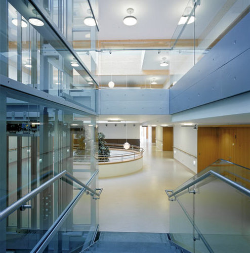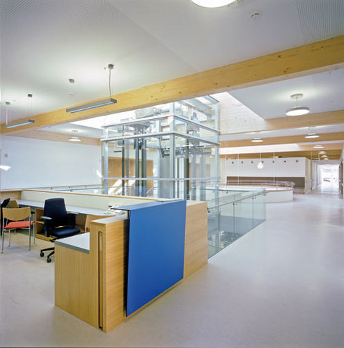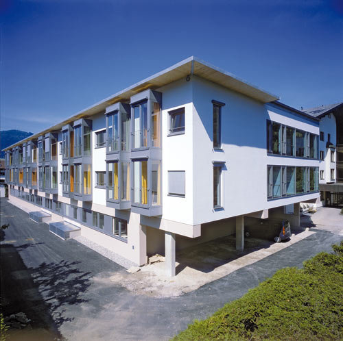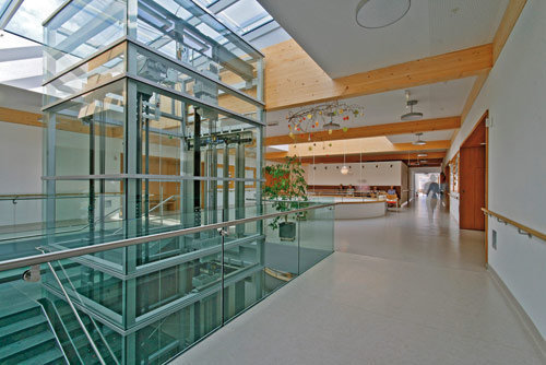 Die Wohn- und Pflegestationen liegen in den zweihüftigen Obergeschossen. Die breite Mittelzone ist durch Lichthöfe und Terrassen abwechslungsreich strukturiert, und bietet ausreichend Platz für Aufenthaltsräume und Bewegungsflächen. Der Schwesternstützpunkt liegt ebenfalls zentral in dieser Zone und bietet einen guten Überblick. Die Zimmer sind parallel zur Mittelzone verschoben, wodurch Belichtung und Ausblicke verbessert werden. Eine zukünftige Erweiterung um 10 Zimmer über der zum Garten gerichteten Terrasse ist möglich. Großflächige Glaselemente im Erdgeschoß ermöglichen das Öffnen der Räume über die vor gelagerte Lärchenholzterrasse