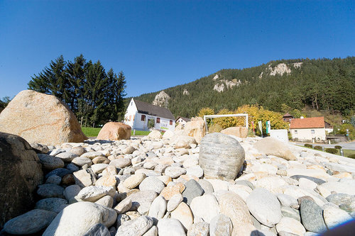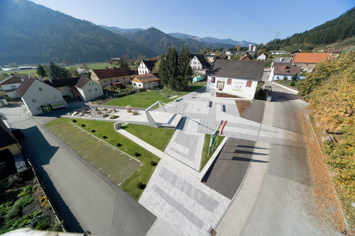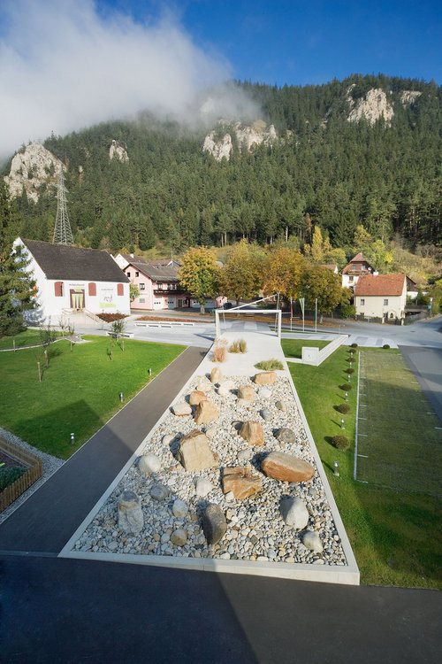 Am Platz findet sich ein Brunnen, der im Sommer als Kindertollplatz genutzt wird, eine Bühne für diverse Veranstaltungen, ein steinernes Flussbett als landschaftliches Verbindungselement zwischen Platz und Steinrisserhaus, ein Apfelgarten mit 12 verschiedenen alten, heimischen Sorten, ein Schaukräutergarten mit Kräuterspirale und Information über die verschiedenen Wirkungen der Kräuter, ein Kinderspielplatz, eine überdachte Pergola, diverse Sitzbänke mit Holzauflage, Maibaum- oder Adventkranz- bzw. Weihnachtsbaumverankerung mit Elektrifizierung, Beflaggung und ein Trinkbrunnen.