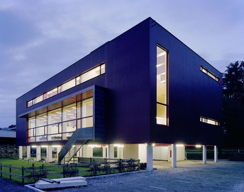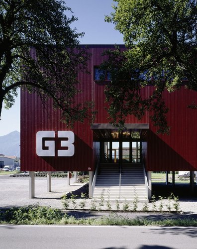 Über eine einläufige Außentreppe oder einen Lift vom Parkplatz aus gelangt man ins Entree. Eichenindustrieparkett am Boden, Saaltüren aus Eiche, Akustikdecke. Klare Raumgliederung. Im Saal blickt man im Süden durch großformatige, gegliederte Fensterelemente in eine heterogene Bebauung, aber auch ins weitere Bergpanorama. Gegenüber an der Nord– und Straßenseite wurden drei außen Kupferverkleidete Ausbuchtungen platziert, wie Vitrinen. Vitrinen innen, mit Nischencharakter - gleichsam introvertierter Ausblick - im Kontrast zur weiten Öffnung der Fensterelemente gegenüber. Vitrinen auch außen, aber dort eher als Raumbildendes, Fassadenstrukturierendes Element mit dem Anspruch, die Fassade zu nobilitieren und Neugierde zu wecken. Die nordseitige „Vitrinen“- und Haupteingangs- Fassade wirkt anders als die Ostseite, die stark den Gewerbecharakter der Umgebung heraufbeschwört. Sie gehören – auch wegen der Wertigkeit des verwendeten Kupferblechs - zum „nobleren“ Teil des Gebäudes.