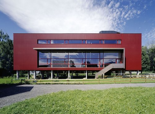 Der Baukörper ist eine rote Kiste auf Stützen. Die reduzierte Plandarstellung zeigt die Qualität der Proportionen. Das Bauwerk ist für den Preis ein sehr gelungenes. (Text: Vera Purtscher)