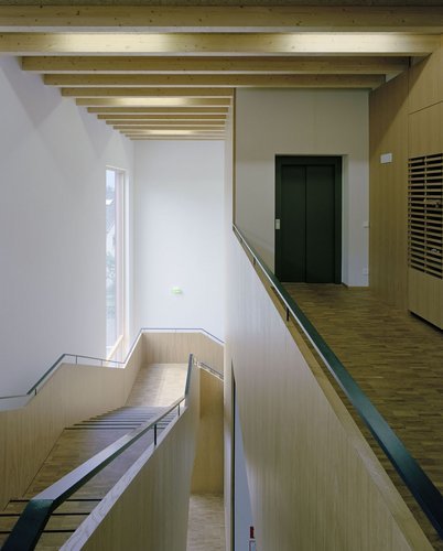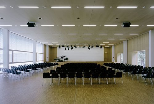 Die Bühne im Saal erfüllt Wünsche diverser Nutzungen, ein Regieraum komplettiert dies. Das eingelassene Taufbecken im Podest weist erstmalig auf den Auftraggeber hin. Denn ein mystischer Raum, ein sakrales Gebäude, ein Zeremoniensaal gibt sich anders. Im Stiegenhaus- und Gangbereich sind magnesiumgebundene Herkalith-Platten verwendet worden - eine kostengünstige Akustikmaßnahme. Außenliegende Fluchttreppen sind ebenso begründbar- wie so manches Detail.