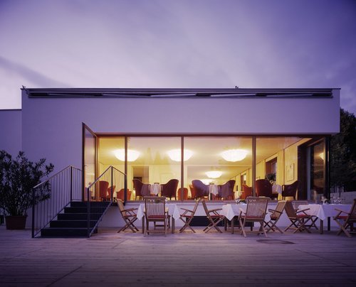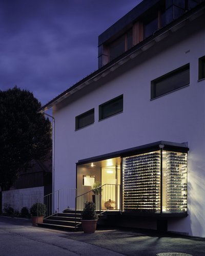 Im umhausten Anlieferungshof ist der Abgang in den großen Kellerbereich platziert: für Lager, Vorrat, Nebenräume. Oberhalb der Gasträume sind hinter jener versteckten Türe der Zugang zu Büroräumen und einer Wohnung im 1. OG mit riesiger Südterrasse, sowie einer Dachgeschosswohnung mit großzügigem Raumkontinuum. So entsteht Privatheit für die Eigentümer und Betreiber des Haubenlokales bei gleichzeitiger professioneller Gäste- Betreuung in klar definierten Bereichen.