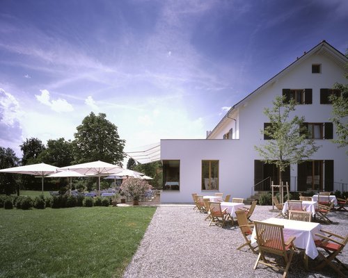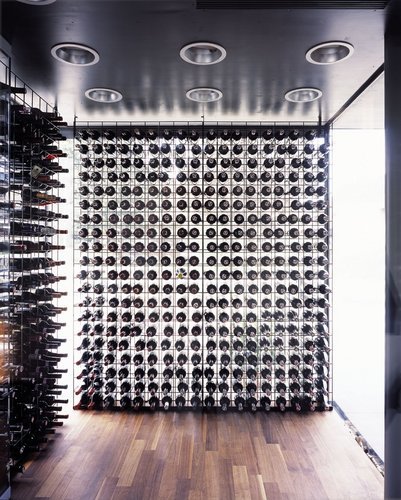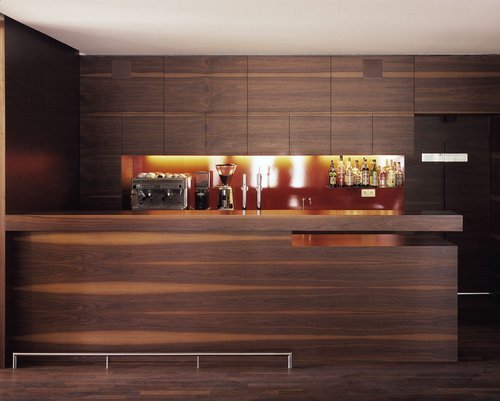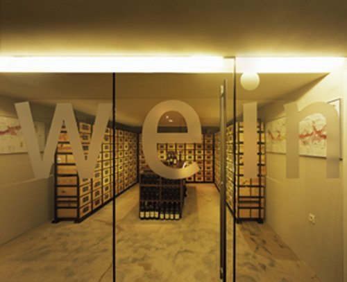 Die Restaurant-Ebene im Halbgeschoß wurde entkernt und südseitig mit großen Öffnungen versehen um gleichsam in den paradiesischen Park einzutauchen, das erhöhte EG-Niveau erweitert die Blickdistanz. Eine Außentreppe führt auf die Terrassenzone; ostseitig ist es eine Rampe, die zum Outdoor-Bistro Bereich führt und nordseitig führt die Eingangstreppe zum „Signet“ des Hauses: ein Weindepot gleichsam im Schaufenster. Der Eingangsbereich ist in dunklem Nussholz gehalten, hinter dessen Paneelen sich die Zugänge in die Obergeschosse und in jenen Bereich des Kellers, der Gästen zugänglich ist, verstecken. Ruhige Linienführung und klare Materialwahl dienen dazu, die vorgegebenen niederen Raumhöhen vergessen zu machen.