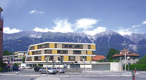 Der viergeschossige Neubaukörper leitet vom Südring kommend den Beginn des Pradler Villenviertels ein und orientiert sich mit seiner Hauptfront nach Süden. In den oberen drei Geschossen wird der Baukörper durch einen jeweils dreiseitig umlaufenden Balkon geprägt, der mit beweglichen farbigen Screens versehen ist, die dem Sonnenschutz sowie den spezifischen Anforderungen der Nutzer dienen (variable Blendungsregulierung) und gleichzeitig gestalterische Elemente der Fassaden sind. Die Nordseite wird durch eine geneigte Wand mit Aluminiumverkleidung gebildet.