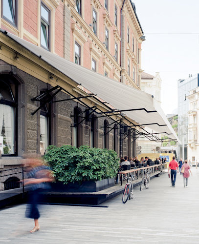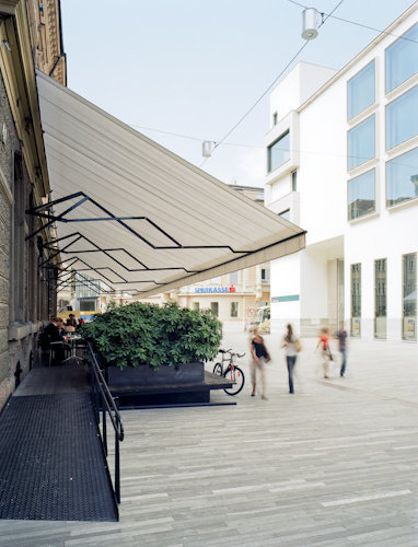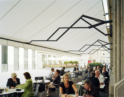 Durch die Wahl der Farben von Konstruktion, Tuch, Tischplatten und Stühlen entsteht ein neutraler, aus all diesen mobilen Elementen strukturierter „Innenraum“, der einerseits in keinerlei Konkurrenz oder schwächliche Nähe zum historischen Inneren des Cafés tritt und andererseits den neu entstandenen Ton von weißem Putz und grauweißem Stein am Platz ergänzt. Durch diese Maßnahme wurde der Platz zum Platz, erhielt seine „Bühne“ und wurde selbst „Bühne“. (Text: Architekt)