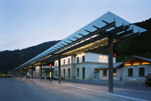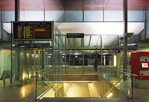 Die Mittelbahnsteige und Busterminals wurden mit einem von OSTERTAG ARCHITEKTEN für die ÖBB entwickelten Konstruktionssystem überdacht, das sich durch eine silberfarbene, glatte Untersicht mit integriertem Beleuchtungs- und Installationsequipment auszeichnet. Infopunkte, gläserne Warteboxen und Bänke führen die Kontinuität der Ausstattung am Bahnsteig fort. (Text: Claudia Wedekind nach einem Text von Andrea Ostertag)