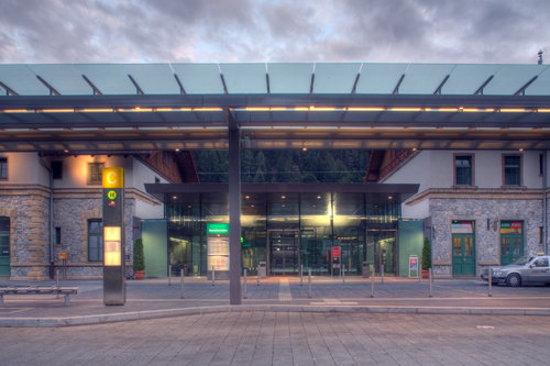 Drei räumliche Sequenzen bestimmen die Architektur des neuen Bahnhofs: ein neu gestalteter Vorplatz mit Busterminals und überdachten Bike&Ride- bzw. Park&Ride-Zonen, eine frei stehende Stahl-Glas-Konstruktion, die als neue Halle zwischen die beiden bestehenden Hauptkörper geschoben wurde und neu überdachte, breite Bahnsteige. In der Eingangshalle, deren Transparenz die Ankunft und Abfahrt der Züge weithin sichtbar macht, befinden sich Ticketautomaten, Infopunkte und mittig die Zugangstreppen und Lifte zu den Unterführungen und weiter zu den Mittelbahnsteigen. In den beiden angrenzenden, revitalisierten Hauptgebäuden, sind das ÖBB-Kundenzentrum, eine Buchhandlung mit Trafik und eine Cafeteria untergebracht. Böden aus rotbraunem Quarzsandstein, mit hellem Naturstein verkleidete Wände sowie ein Beleuchtungssystem aus direktem und indirekten Licht schaffen ein klar strukturiertes Ambiente und verdichten die „Lesbarkeit“ des Gebäudes.