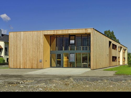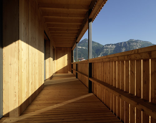 Außenbezug | Die Terrasse nach Süden im Erdgeschoss erschließt auch den Garten. Zäune sind nicht notwendig und nicht beabsichtigt. Der große Balkon über der Terrasse wird als Sammelplatz zur Fluchttreppe genutzt. Jedes Zimmer hat seinen Ausgang nach draußen. Die Balkone sind zwar geborgen und im Stile einer Veranda ausgeführt, werden jedoch nicht abgetrennt. Wieder ergibt sich hier bewusst eine gemeinschaftliche Zone.
