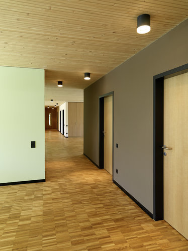 Konzept | Zwei Geschoße mit identen Grundrissen strukturieren zwei betreute Wohngruppen und zwei separate Wohnungen. Ein ausgeklügeltes Farbkonzept gibt den Bewohnern eine gut wahrnehmbare Adresse, mit der eigenen Farbe. Pflegebad und Waschküche bleiben im Raster und sind mittig angeordnet. Zwei Zimmer bilden eine Einheit, dazwischen entstehen Wohnzonen. Der große Wohn- Essbereich ist der Küche zugeordnet, die weiteren Zwischenräume bieten sehr individuelle Möglichkeiten. Die Verglasung bis zum Boden erlaubt auch im Liegen freien Ausblick. Das Zusammenspiel von Intimität und Gemeinschaft in diesen Bereichen hat große therapeutische Bedeutung. Am Kopf des Gebäudes befindet sich im Erdgeschoss beim Eingang das Büro des Leiters, darüber der Besprechungsraum für das Team.