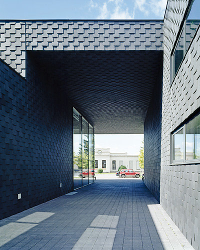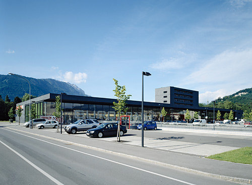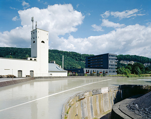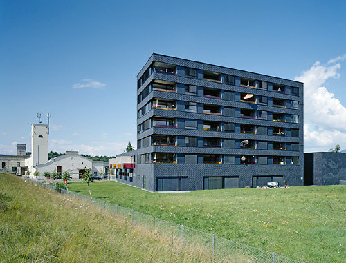 Der Neubau spannt den Zwischenraum zum Textilwerk als Platz auf und bezieht die spätere Umnutzung ein. Ein weit auslaufender Sockel beinhaltet Supermarkt und ein weiteres Diskontgeschäft. Direkt anschließend orientiert sich das siebenstöckige Wohnhaus zum Fluss. Ein Durchstich öffnet die Wegbeziehung zum projektierten Wohnbaugelände. Schwarzgraue Schiefer-Schindeln sind durchgehendes Fassadenmaterial.