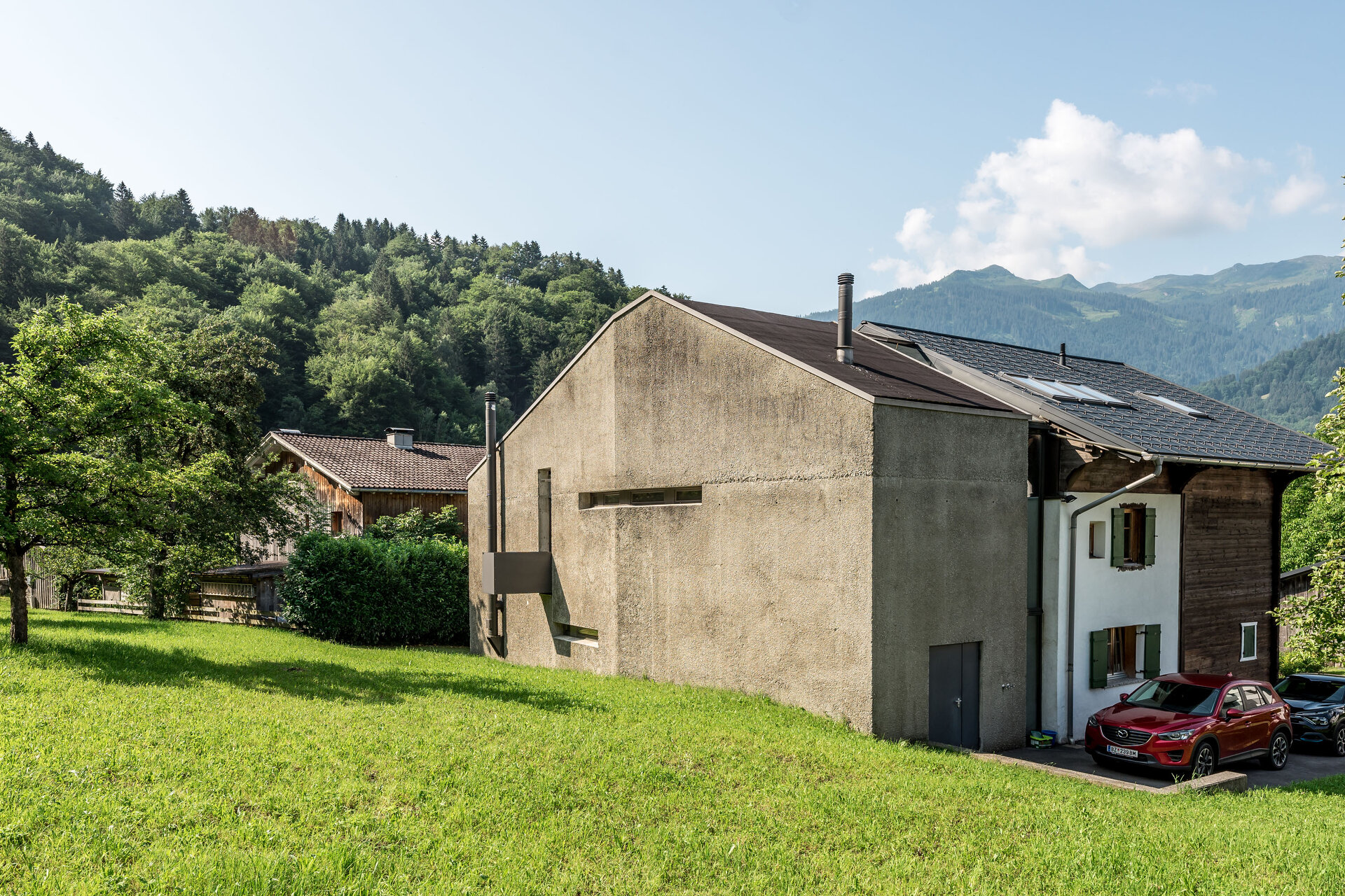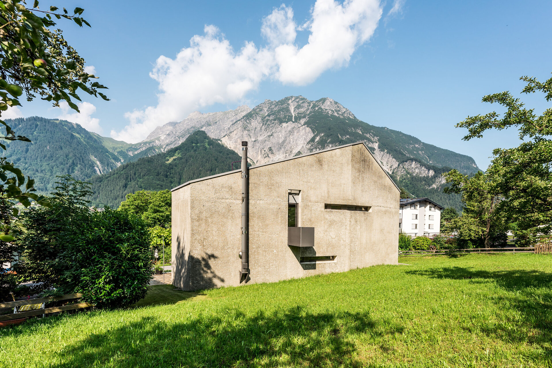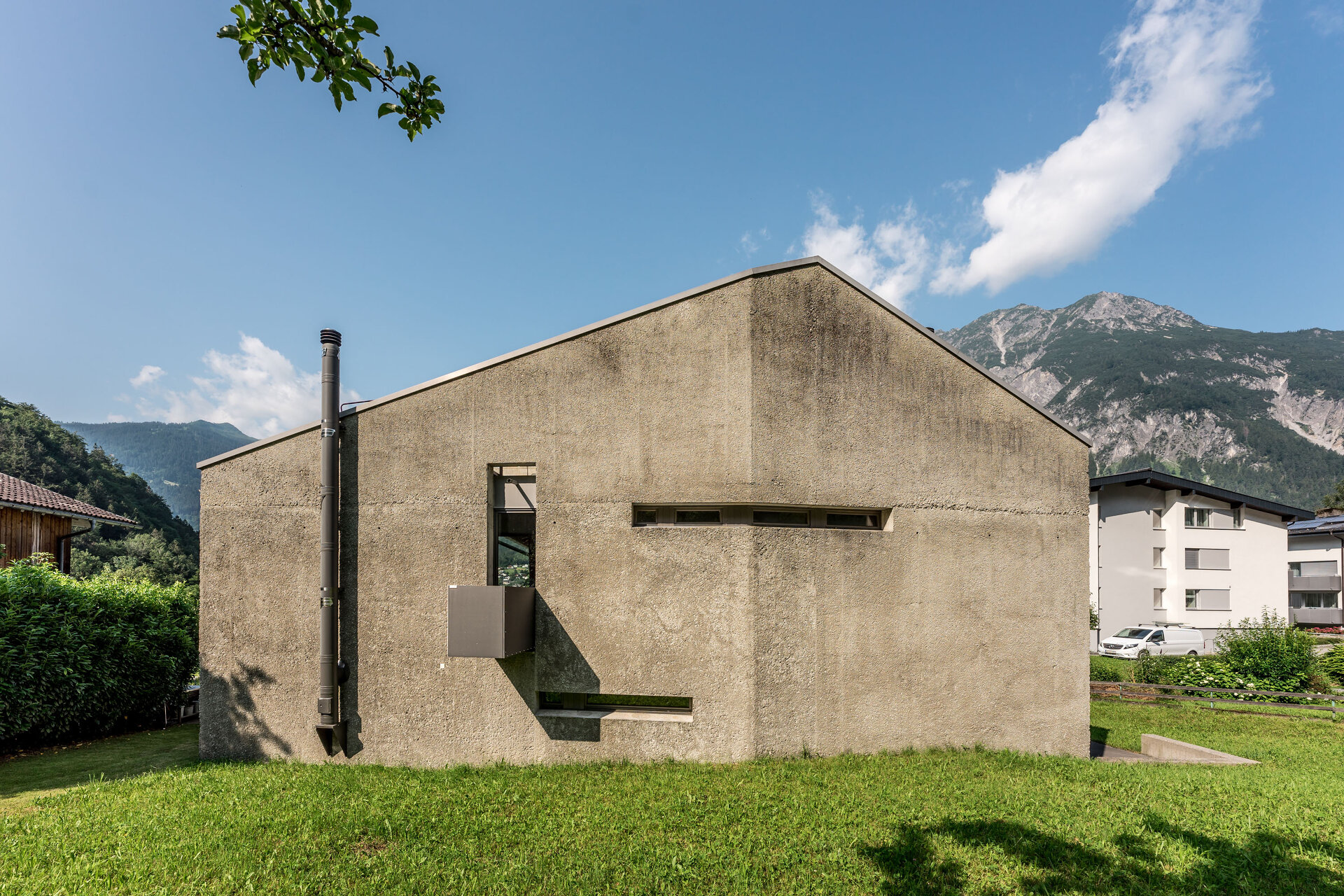 Die abstrakte Fassade aus Sichtbeton mit grau-braunem Korn und gekratzter Oberfläche kontrastiert die Skulptur mit Eichenholzfenster, Vordach und einem Balkon. (Text: Martina Pfeifer-Steiner)