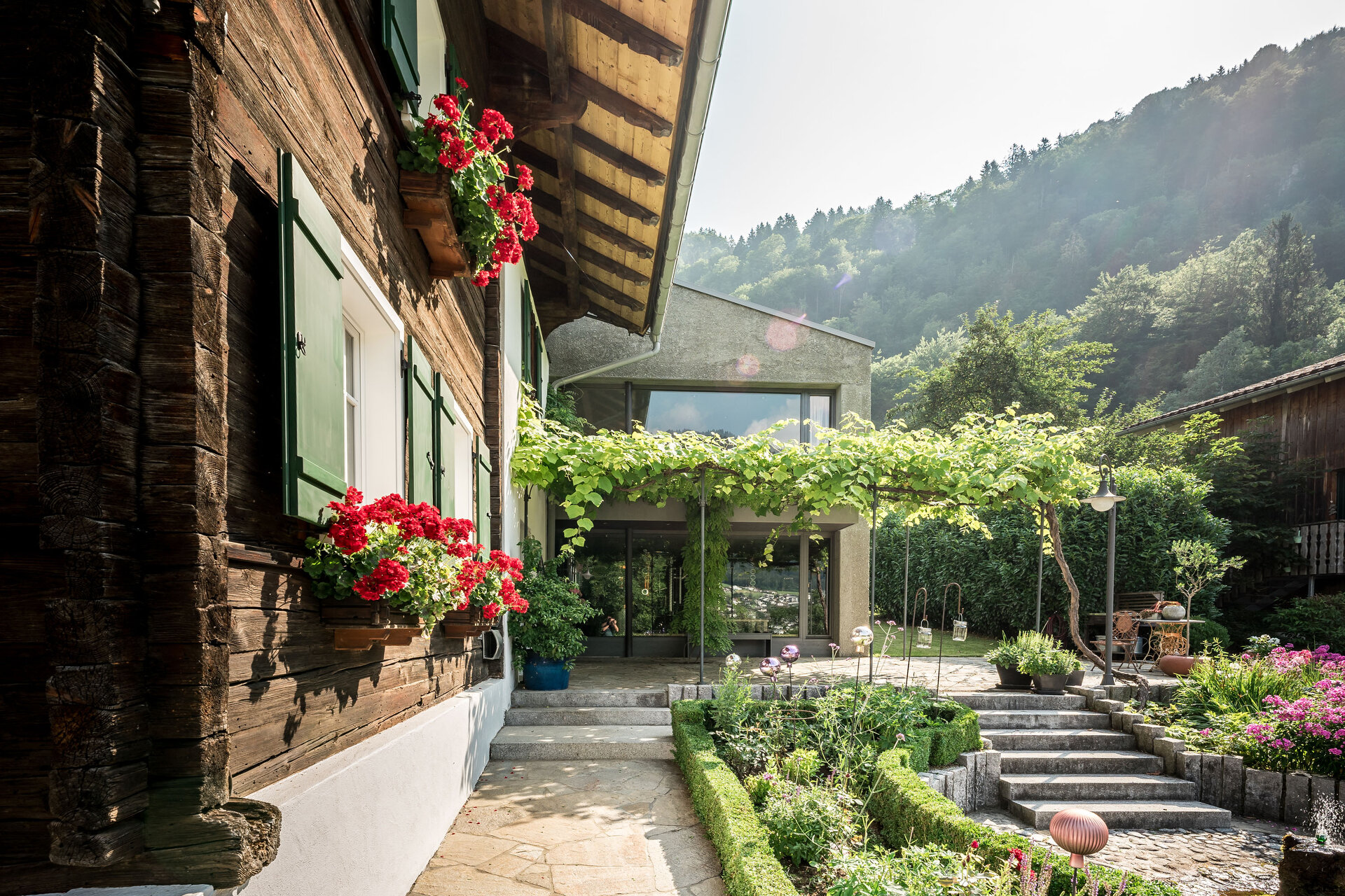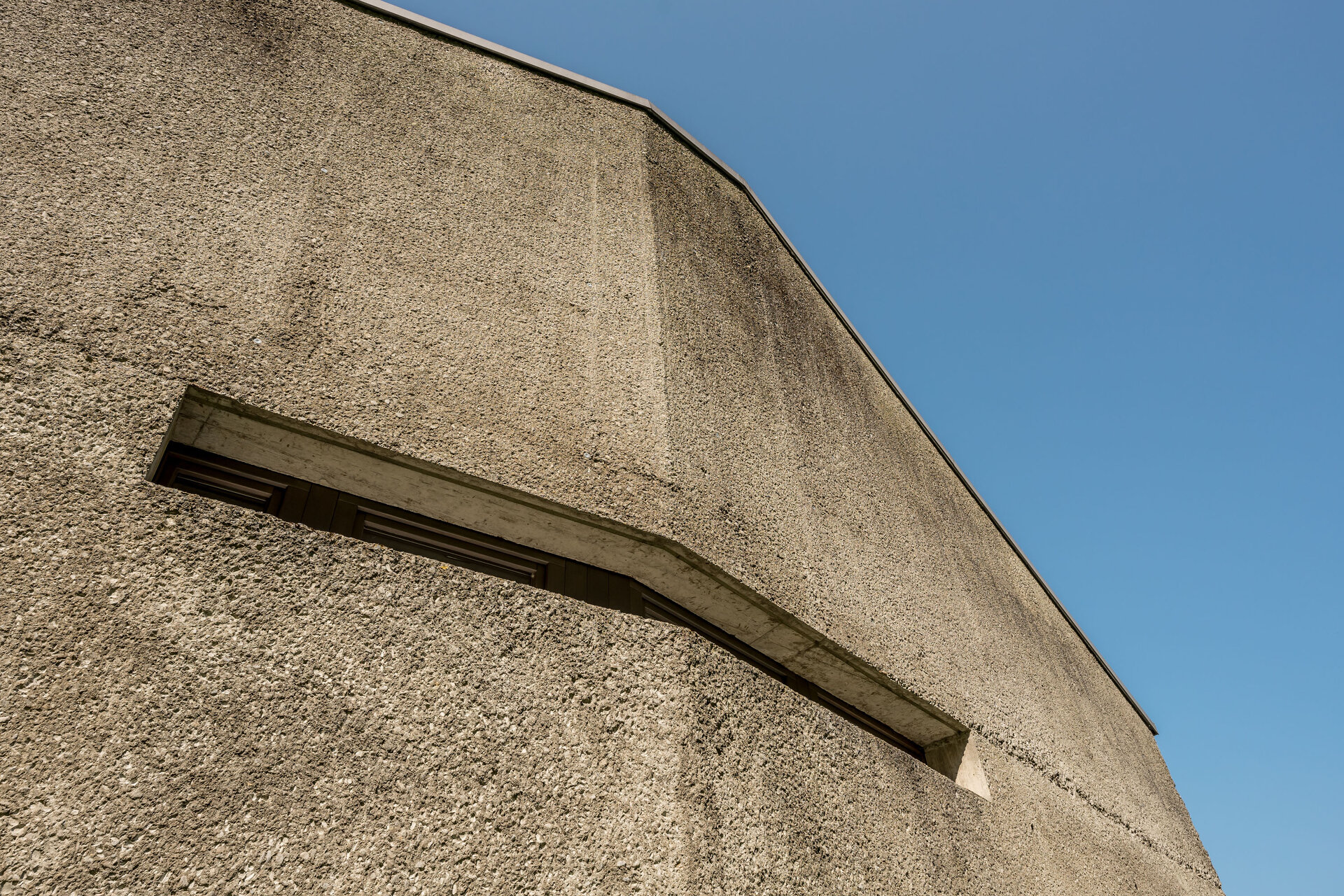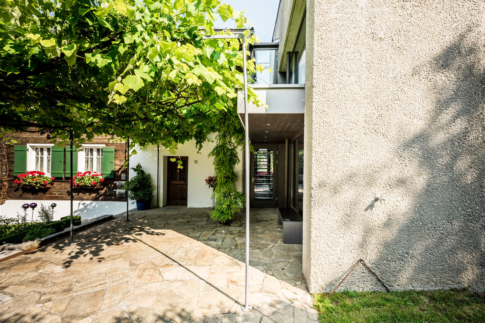 Die abstrakte Fassade aus Sichtbeton mit grau-braunem Korn und gekratzter Oberfläche kontrastiert die Skulptur mit Eichenholzfenster, Vordach und einem Balkon. (Text: Martina Pfeifer-Steiner)