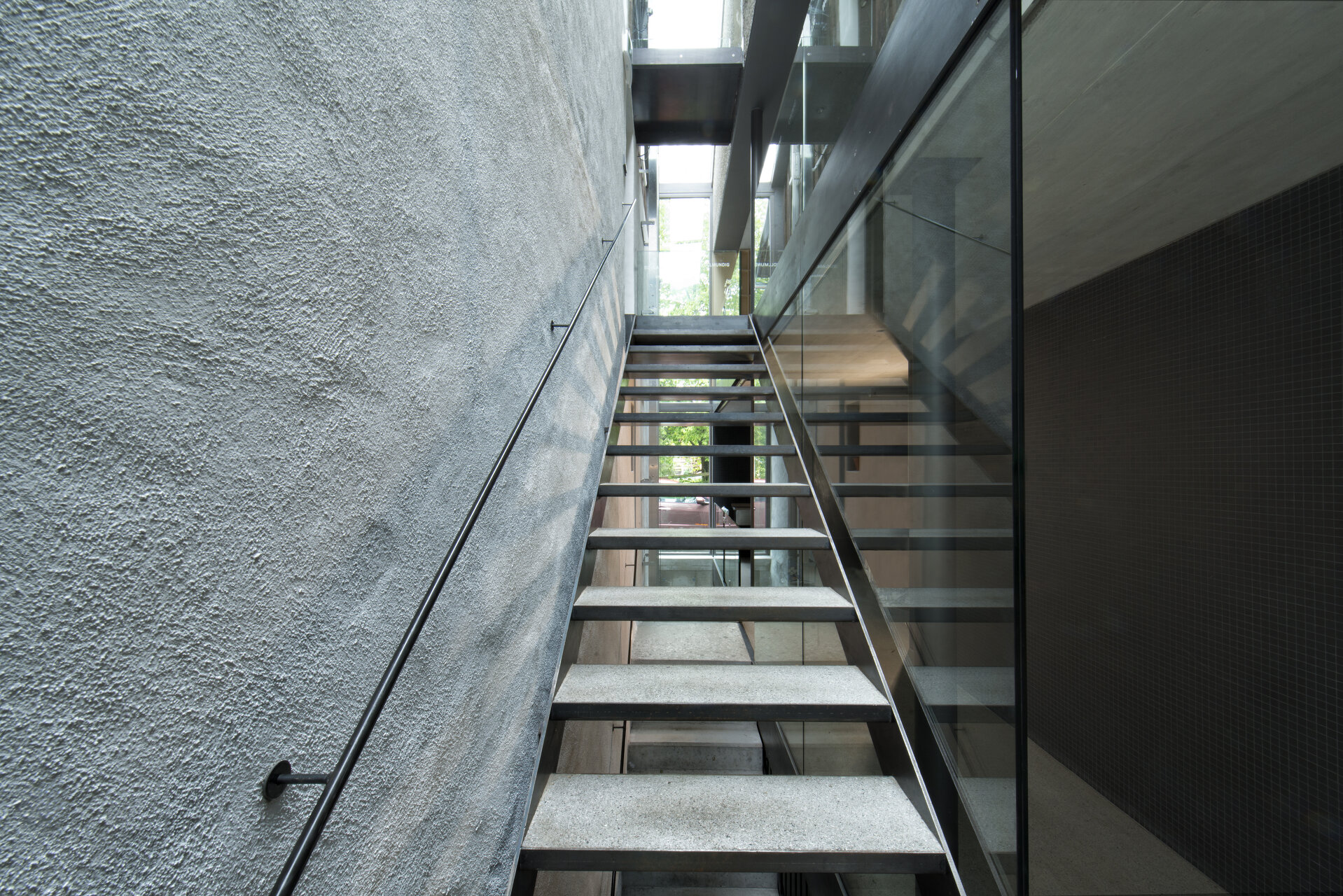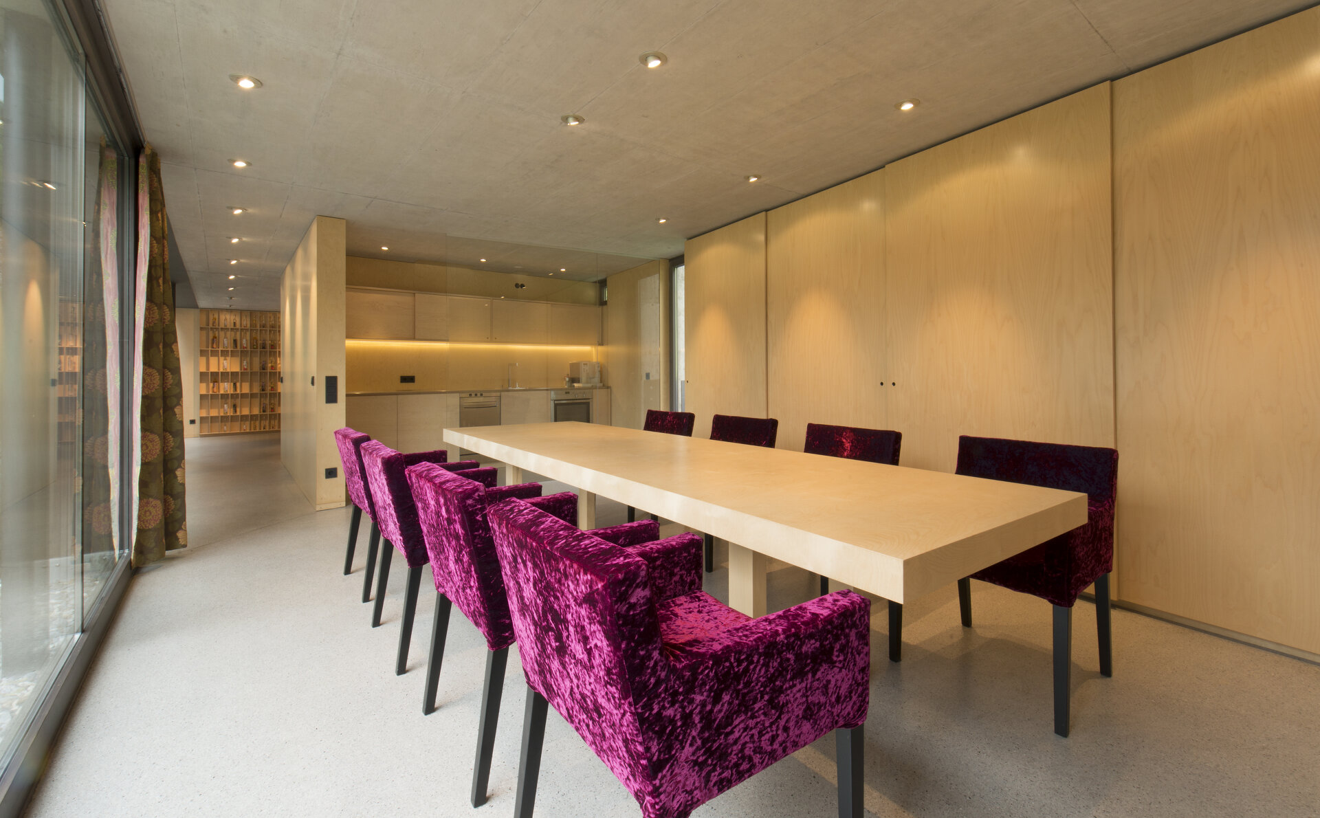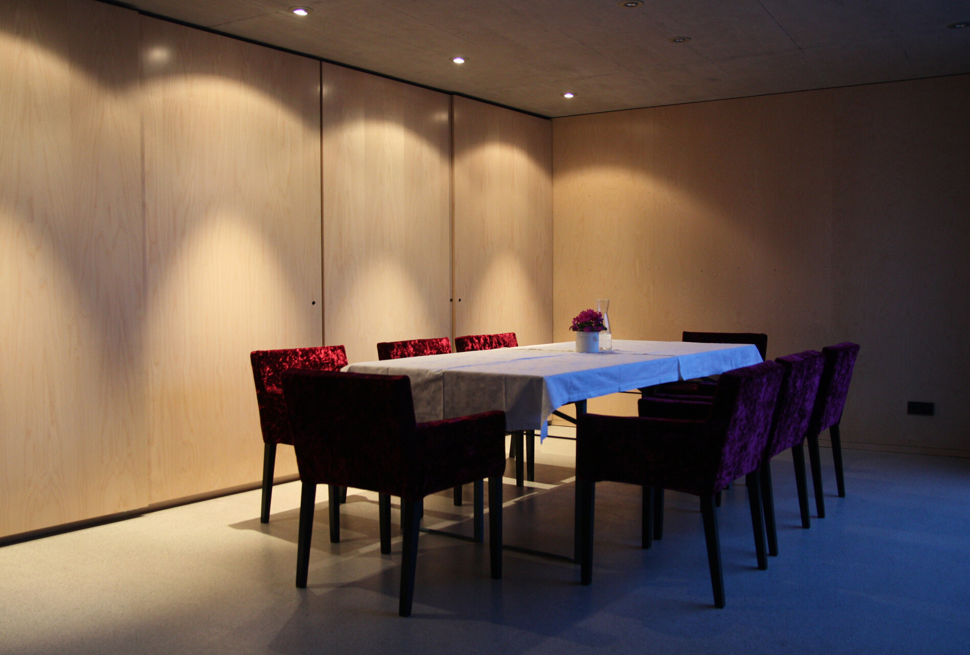 Die unterschiedlichen Funktionen sind in der Materialisierung ablesbar. Die Verkleidung der „technischen“ Räume ist aus Gipskartonplatten und keramischen Belägen. Die Obergeschosse werden mit Birkensperrholzplatten ausgebaut. In den Verkleidungen integrierte Borde und Schaukästen, ein Glas-Screen, der auch als Leinwand fungiert, sind wohltuende Spielereien zum Thema. Ein durchdachtes Lichtkonzept erlaubt verschiedene Stimmungsbilder.