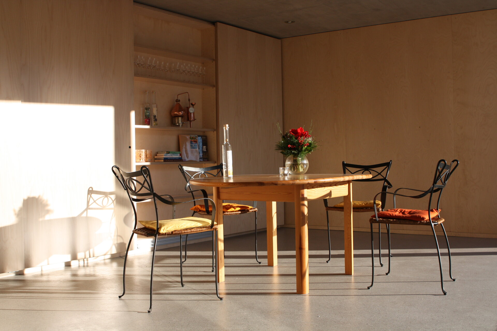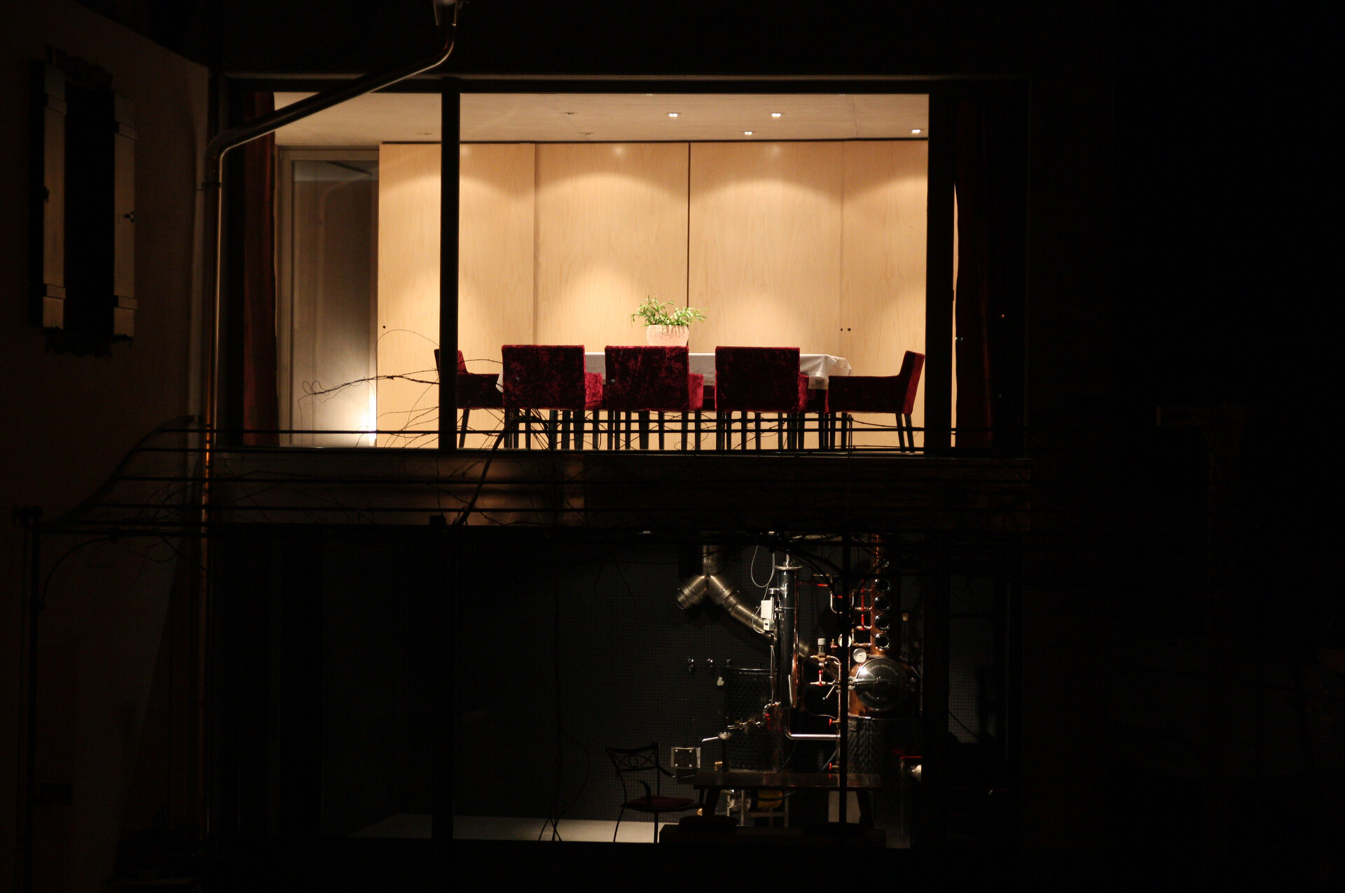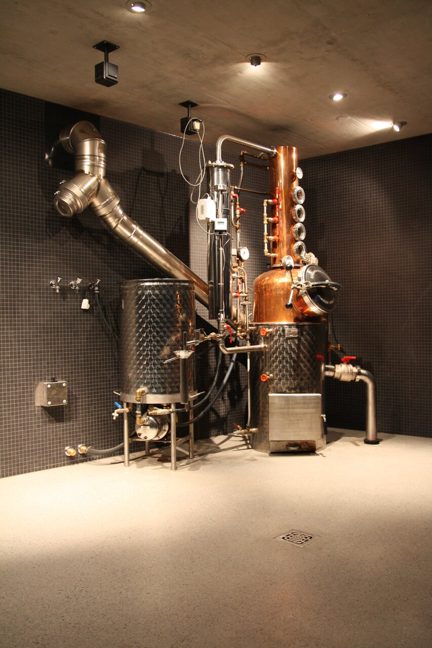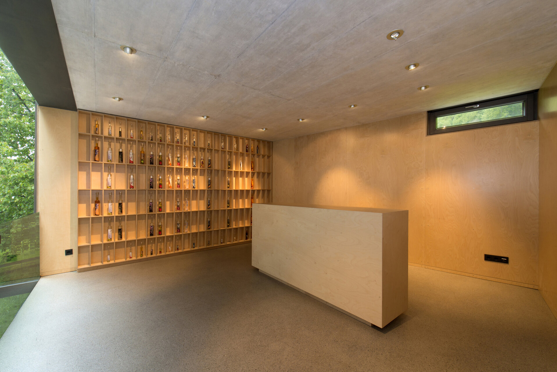Die eigentliche Brennerei mit Werkstatt, dem Raum zur Herstellung der Maische sowie einem kleinen Labor ordnet sich im Erdgeschoss des Neubaus an. Über eine Stahltreppe gelangt der Besucher in den Degustationsraum und den zur Galerie hin offenen Präsentations- bzw. Verkaufsraum. Eine kleine Küche und Sanitärraum komplettieren den öffentlichen Bereich. Im Dachgeschoss kann das private Wohnzimmer und die großzügige Dachterrasse nur vom Altbau aus betreten werden. In der Unterkellerung sind Lager- und Haustechnikräume untergebracht.