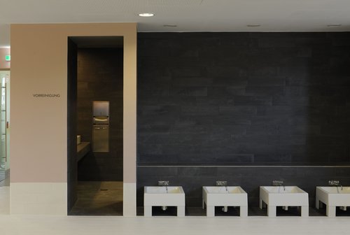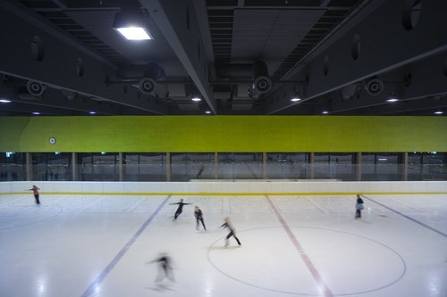 Der neue Eingang liegt zwischen den beiden Eishallen, so werden diese ebenso wie das Freigelände unmittelbar erschlossen. Hallenbad und Saunalandschaft bleiben über das Haupthaus erreichbar. Diese Bündelung entspricht der Bedeutung der signifikanten Fassade und ihrer prominenten, der Stadt zugekehrten Stellung.