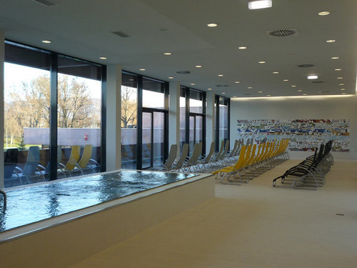 Ein Teil der Saunalandschaft ist im „Schwebebalken“ des Neubaus untergebracht, wodurch eine anregende Verschränkung von Alt- und Neubau entsteht. Die Auskragung begleitet zusätzlich schützend den Weg.